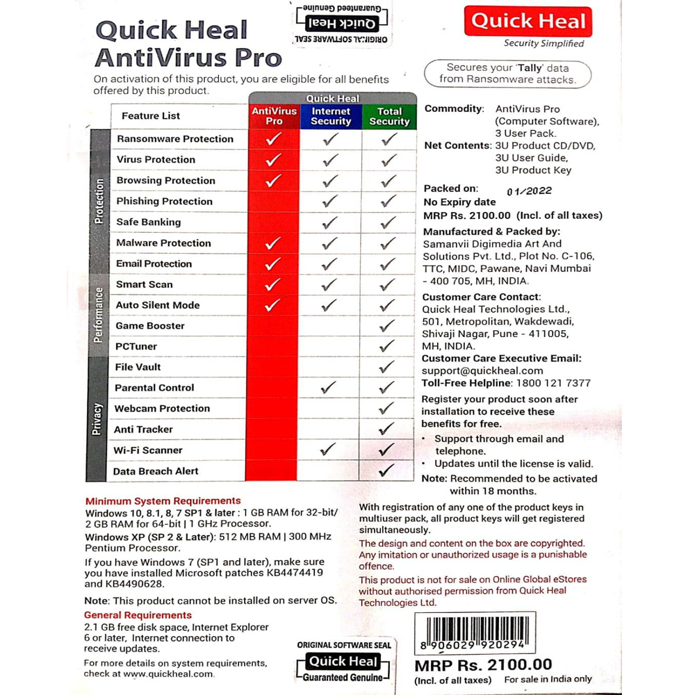 Antivirus Quick Heal Antivirus Pro 3PC 1YR LR3 Quick Heal Availability: 12 in stock